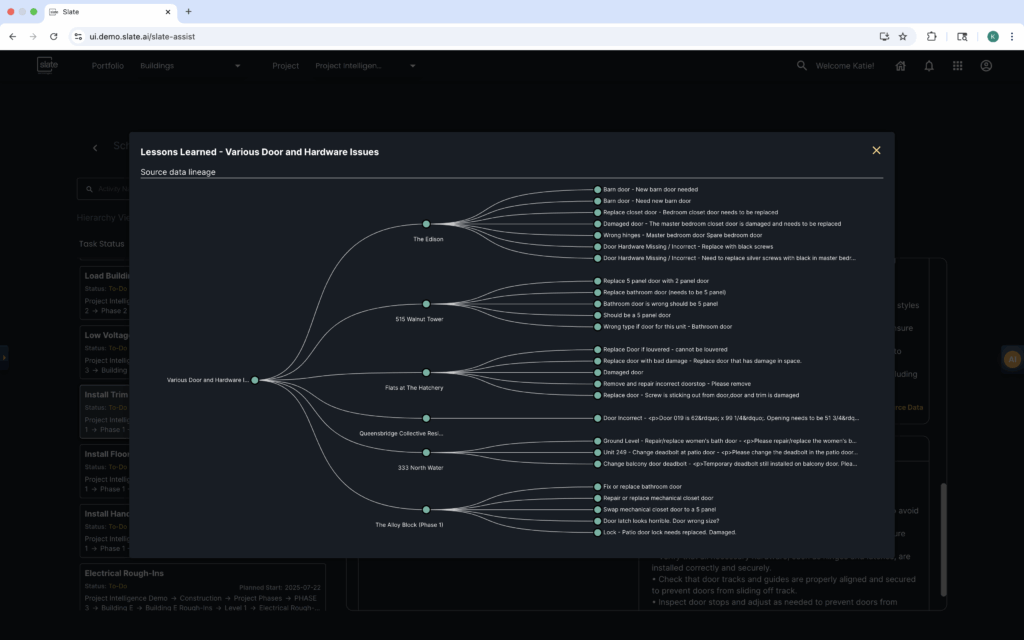 Using historical project data, Slate generates lessons learned tied directly to upcoming work. If an activity has a known history of coordination issues, design conflicts, or repeated field problems, Slate surfaces that information before work begins. These lessons can be pushed into operational platforms like Procore so field teams receive guidance inside the tools they already use.